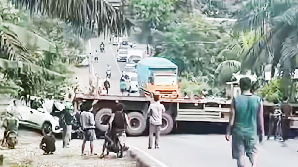 KECELAKAAN : Insiden kecelakaan truk trailer mengangkut batangan besok yang tak kuat menanjak sehingga terguling melintang, menutupi seluruh ruas Jalintim wilayah Muba, Sabtu sore. -Foto : Ist-