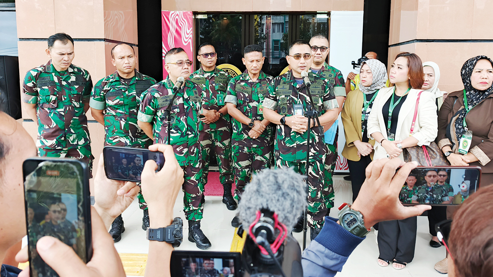KONFERENSI PERS: Kepala Dilmil I-04 Palembang Kolonel Chk Fredy Ferdian Isnartanto dan Kepala Otmil I-5 Palembang Kolonel Laut (H) Mochamad Muchlis, memberikan penjelasan kepada awak media, usai pelimpahan berkas 2 tersangka TNI bunuh 3 polisi, kemarin. -FOTO: BUDIMAN/SUMEKS-