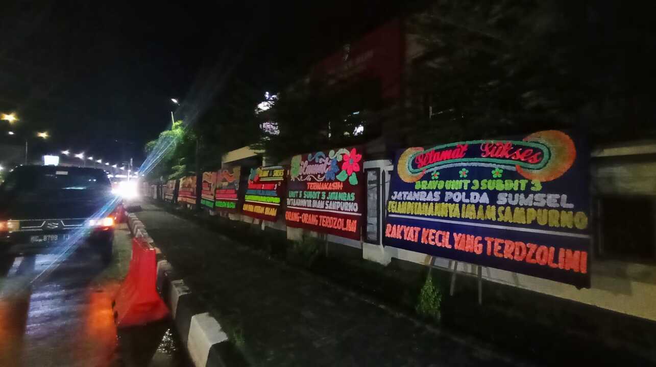Penahanan Eks-Kabag Keuangan Prabumulih terkait penipuan Rp3,5 miliar disambut karangan bunga di Mapolda Sumsel. Foto: kemas/sumateraekspres.id--