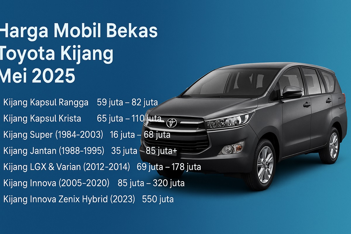 Per Mei 2025, harga mobil bekas Kijang bervariasi, mulai dari Rp 16 juta untuk model lawas hingga lebih dari Rp 550 juta untuk model hybrid terbaru.