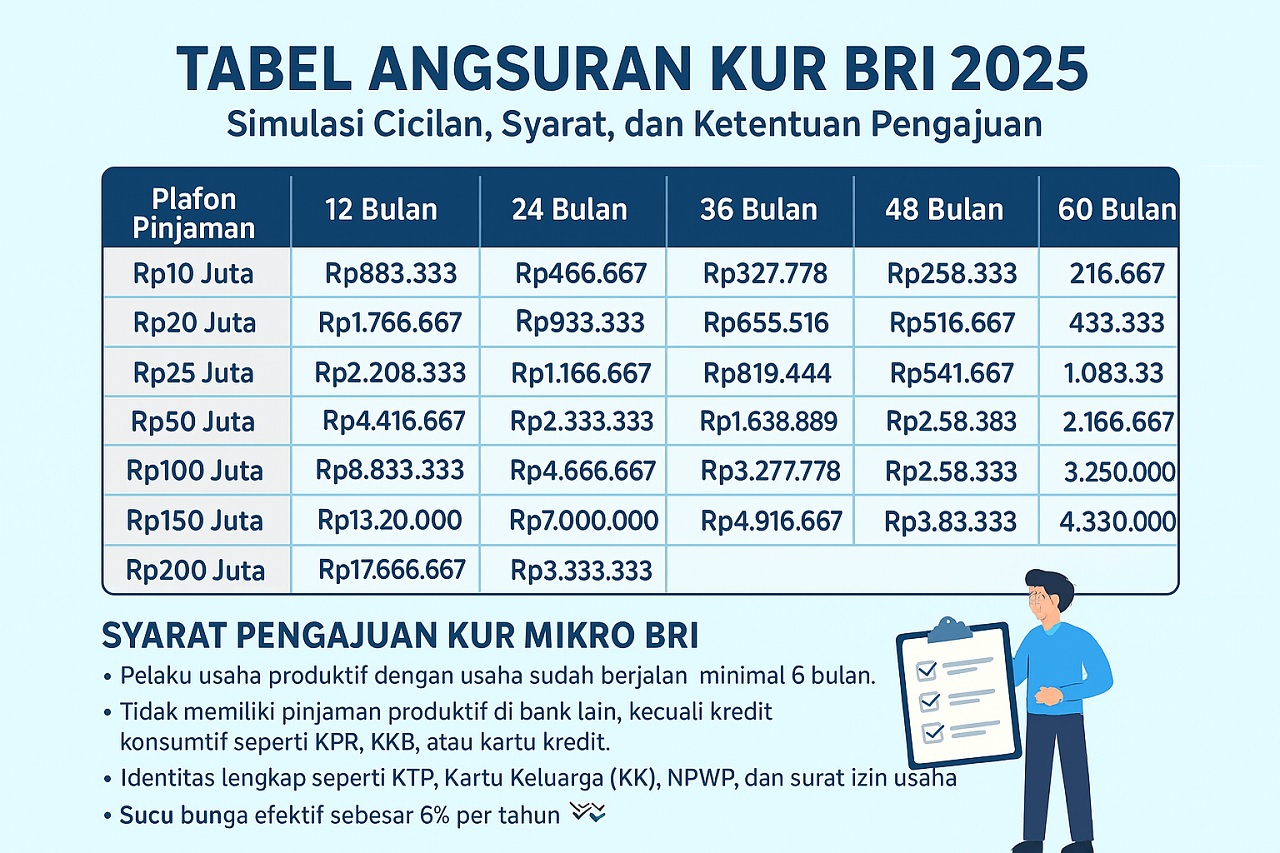 Informasi detail mengenai KUR BRI 2025, termasuk simulasi angsuran dari puluhan juta hingga ratusan juta rupiah, dapat dilihat melalui situs resmi BRI dan portal berita ekonomi terkini.