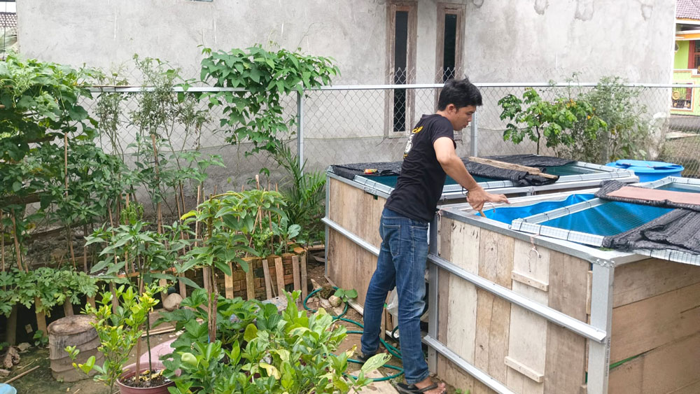 Di sela kesibukan bekerja, bapak dari satu anak ini memanfaatkan pekarangan rumah untuk berkebun dan beternak ikan patin.