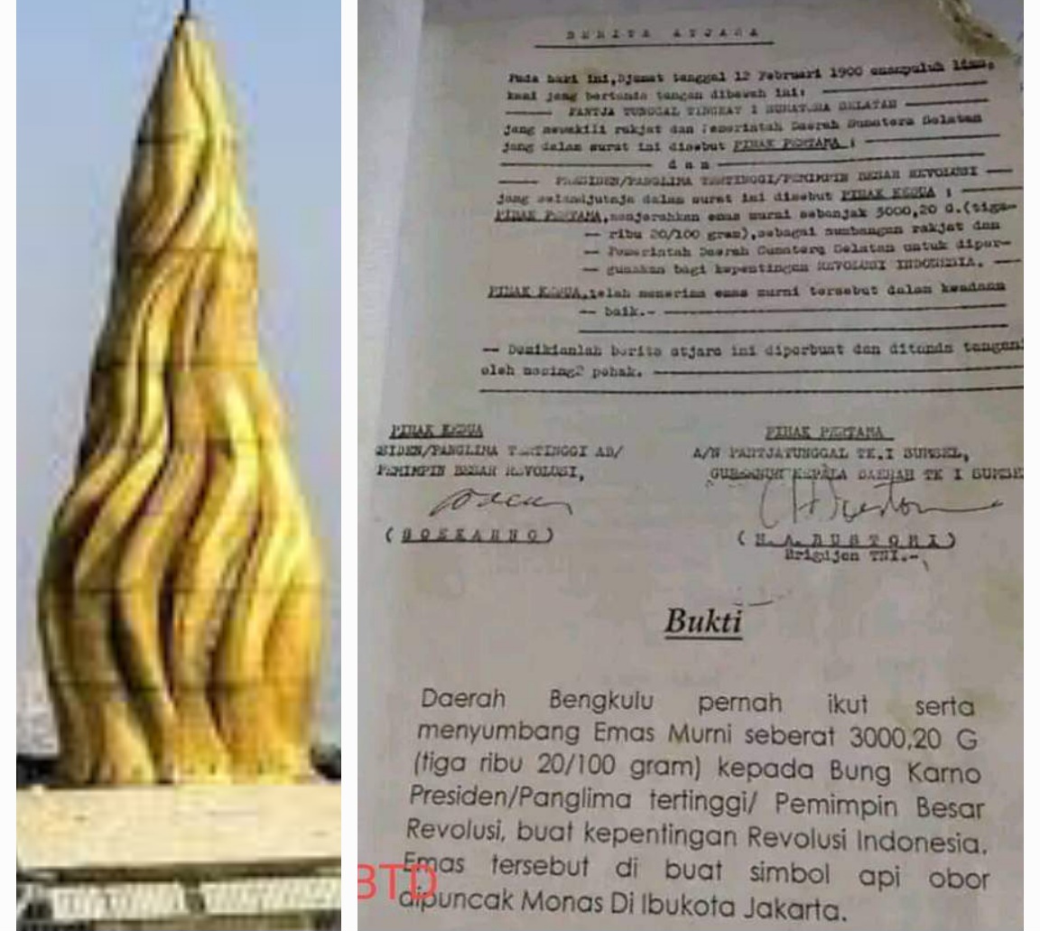 “Daerah Bengkulu pernah ikut menyumbang emas murni seberat 3.000,20 gram kepada Bung Karno, Presiden/Panglima Tertinggi/Pemimpin Besar Revolusi, untuk kepentingan revolusi Indonesia. Emas tersebut dibuat menjadi simbol api obor di Puncak Monas di Ibukota Jakarta,” demikian kutipan isi dokumen tersebut.
