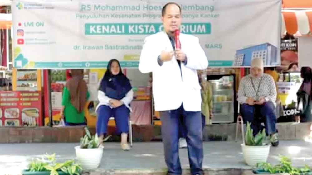 SOSIALISASI: Dokter Kebidanan dan Onkologi RSMH Palembang, dr Irawan Sastradinata SpOG Subsp ONK MARS sosialisasikan kista, cara pencegahan dan penanganannya di Taman Edukasi RSUP Mohammad Hoesin.-foto: agustina/sumeks-
