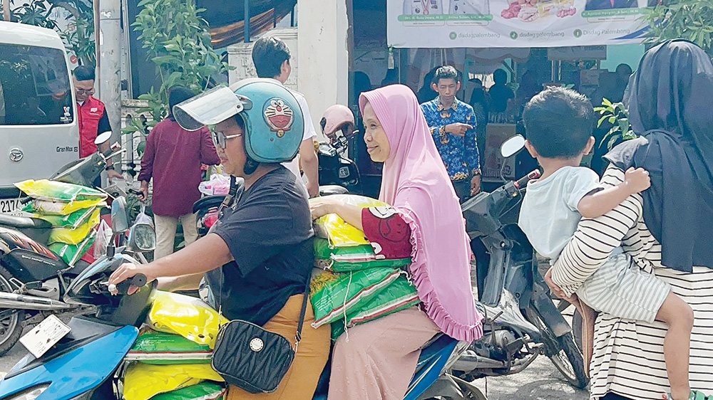 BORONG BERAS: Dua warga dengan berboncengan sepeda motor terlihat memborong beras SPHP yang dijual dengan harga di bawah harga pasaran pada kegiatan Pasar Murah yang digelar oleh Dinas Perdagangan Kota Palembang di Kantor Kelurahan 13 Ilir, Kecamatan Ilir-Foto : evan zumarli/sumeks -