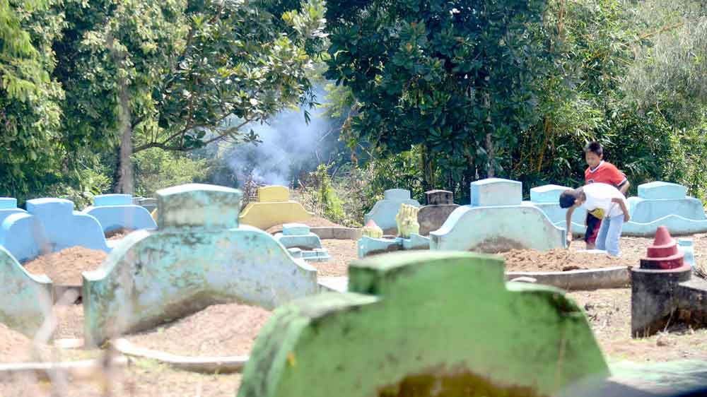 SEMBAHYANG KUBUR : Warga Tionghoa sembahyang kubur pada salah satu makam leluhurnya di TPU Talang Kerikil. Ini merupakan bagian dari tradisi Ceng Beng sebagai perwujudan mencintai dan menghormati para leluhur. (foto bawah) Dua anak terlihat sedang members-FOTO : KRIS SAMIAJI/SUMEKS