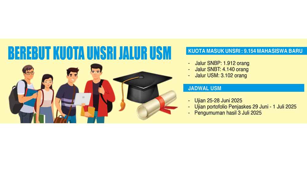 PALEMBANG, SUMATERAEKSPRES.ID - Kesempatan terakhir bagi lulusan SMA/SMK/ MA yang ingin melanjutkan kuliah di Universitas Sriwijaya (Unsri) tersisa jalur Ujian Saringan Masuk (USM) atau jalur mandiri. Pendaftarannya sejak 28 Mei lalu sudah ditutup 20 Juni 2025.