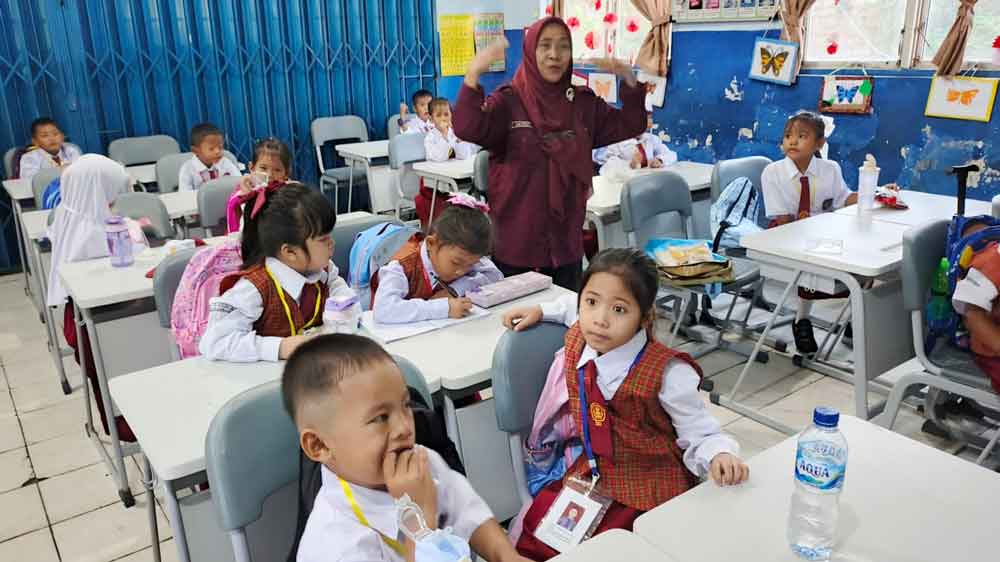 SUMATERAEKSPRES.ID - Para murid baru mengikuti kegiatan MPLS di SD Negeri 88 Palembang. Aktivitas mereka bersama guru masih ditunggui orang tua masing-masing yang menyaksikan dari luar kelas.