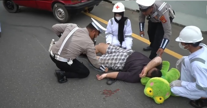 Sejumlah personel PJR turun dari dua mobil dinas, melakukan pertolongan pertama terhadap korban pria yang terkapar di jalan tol. Personel lainnya memeriksa isi mobil sedan, didapati tiga korban lainnya.