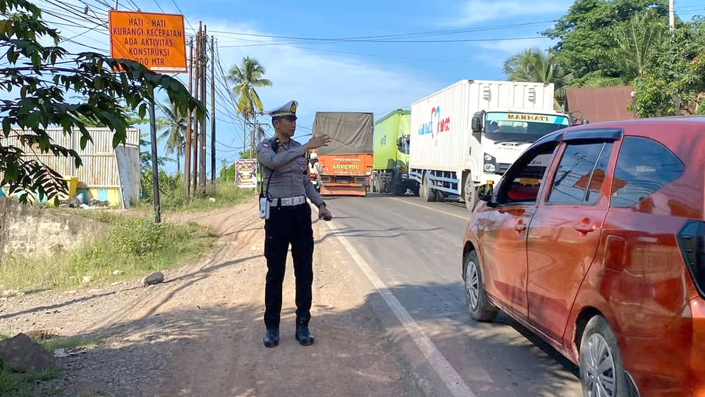 URAI KEMACETAN: Angota Satlantas Polres Banyuasin mengatur lalu lintas untuk mengurai kemacetan di Jalan Palembang-Betung yang terjadi sejak Minggu (30/11) malam.- FOTO: AKDA/SUMEKS-