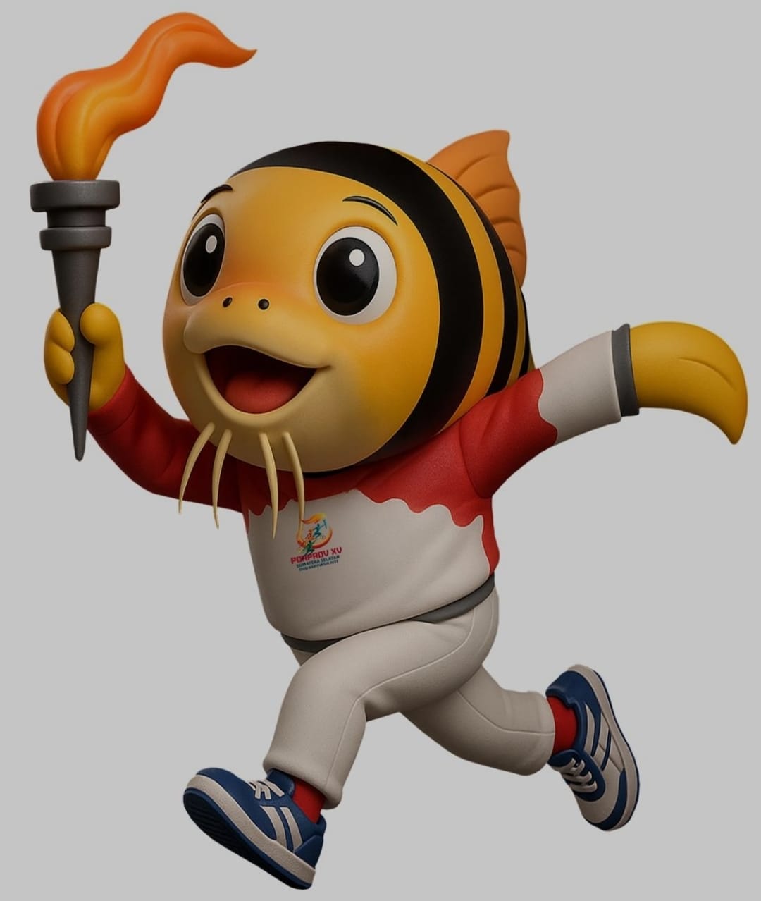 Cublang tampak tengah membawa obor, sebuah lambang semangat, dedikasi, dan kerja keras para atlet untuk mencapai prestasi yang gemilang.