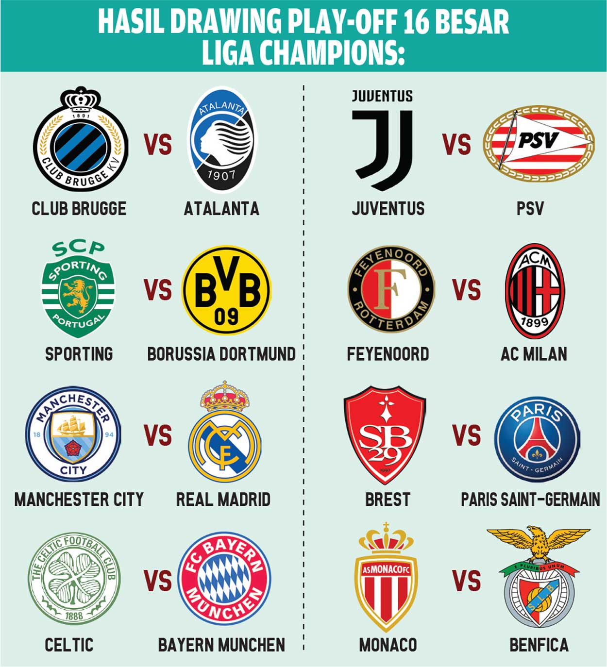 Selain laga itu, akan ada laga sengit lainnya yaitu Celtic vs Bayern Munchen, Juventus vs PSV, Feyenoord vs AC Milan. Diketahui, drawing fase gugur Liga Champions kali ini berbeda dengan musim-musim sebelumnya.